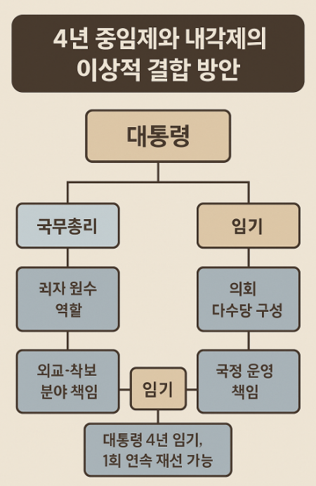 현재 논의되고 있는 개헌안에서는 대통령 4년 중임제와 내각책임제 요소를 결합하는 방식이 유력합니다. 이는 다음과 같은 구조를 갖습니다: