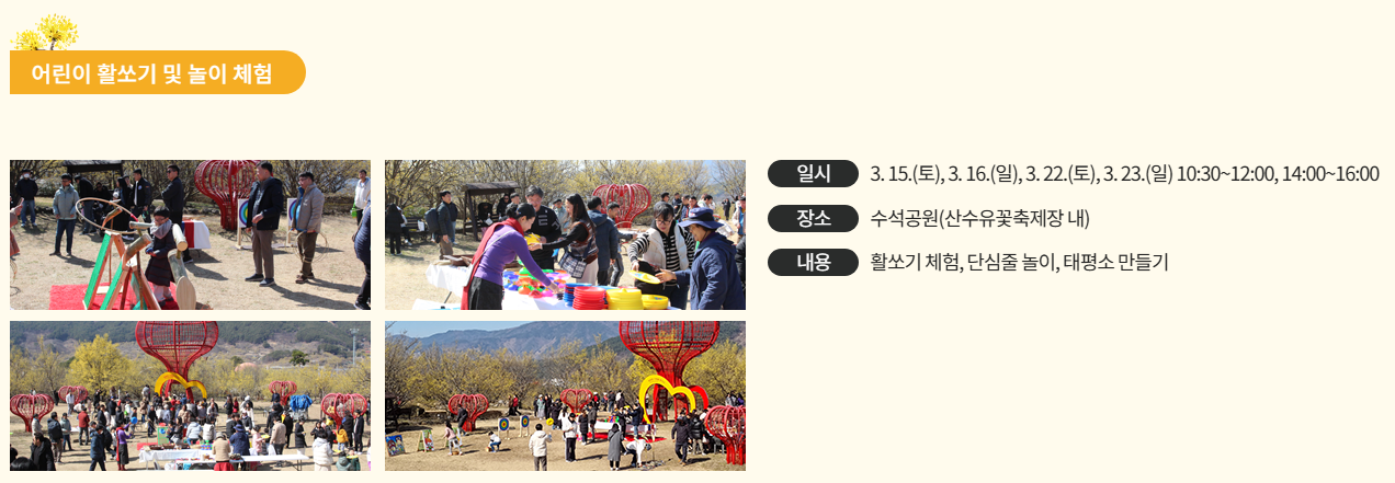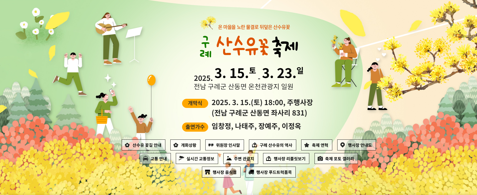 전남 구례군 산동면 일대에서 개최되며, 노란 산수유 꽃이 흐드러지게 핀 풍경이 환상적입니다.