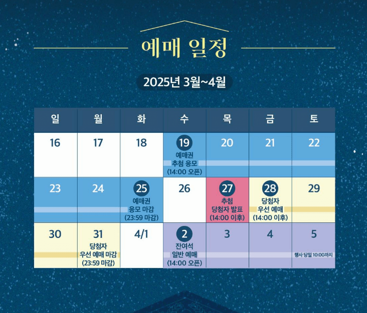 - 당첨자 예매 기간: 2025년 3월 28일(금) 14:00 ~ 3월 31일(월) 23:59