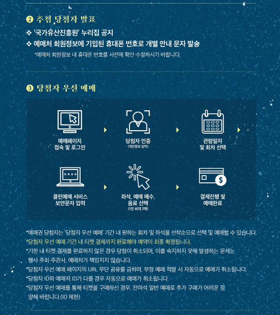 예매는 선착순이 아닌 추첨제! 원하는 날짜에 참여하려면 예매권 추첨에 먼저 응모해야 합니다.