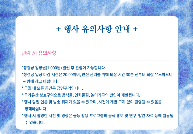 - 궁궐 내 모든 공간은 금연구역이며, 음식물 및 인화물질 반입이 제한됩니다.